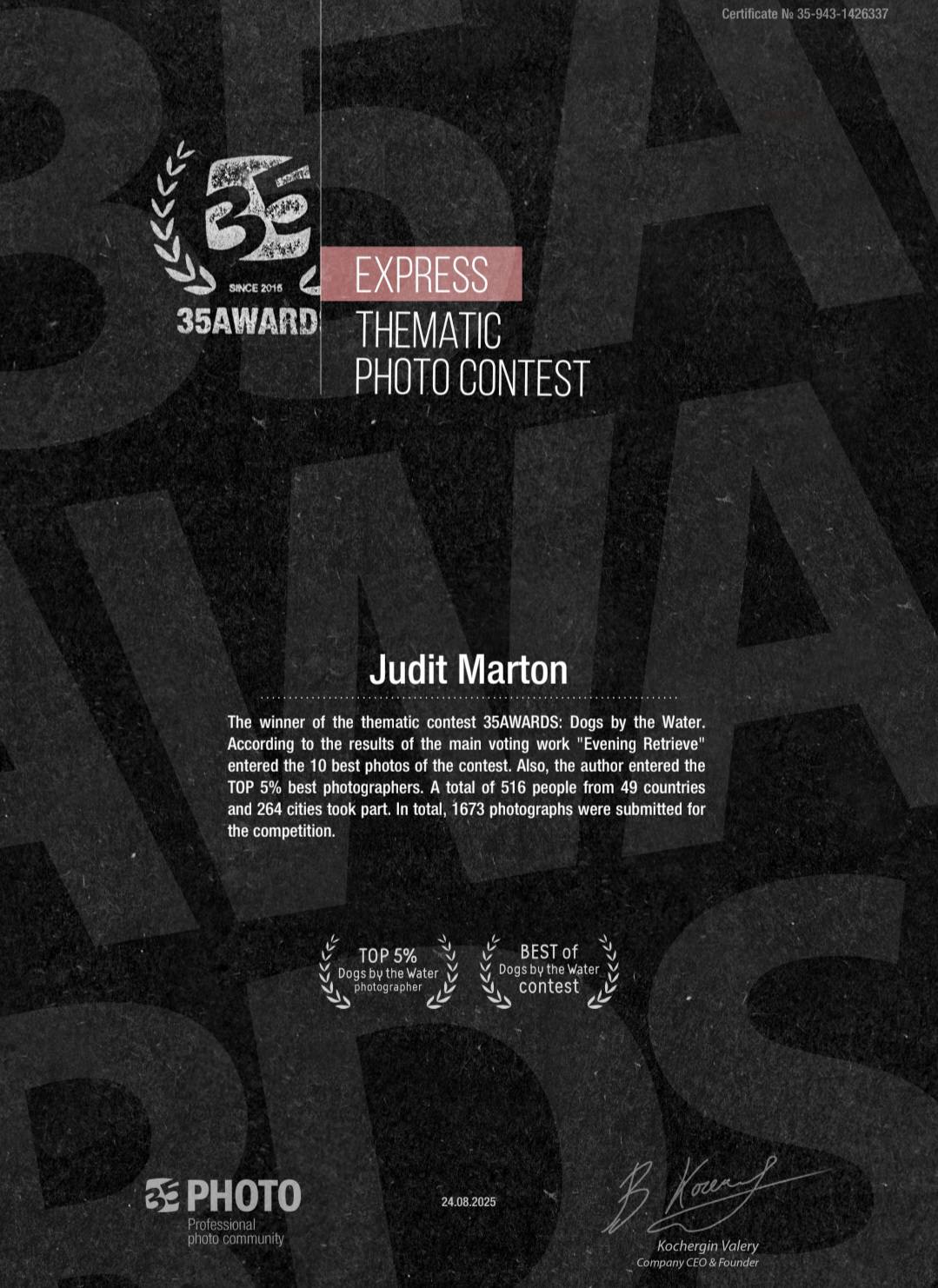 A 35AWARDS – "Pets in Nature" expressz tematikus fotópályázat eredményei alapján a "Where Darkness Ends" című fotóm bekerült a verseny TOP 1% legjobb képei közé. Emellett az összes beküldött képem alapján a TOP 2% Pets in Nature állatfotós közé kerültem be. A mezőny idén elképesztően erős volt – 10 556 fotó érkezett 2604 fotóstól, 86 országból, és olyan inspiráló, elképesztően profi fotósok vettek részt, akik között már önmagában óriási megtiszteltetés szerepelni.