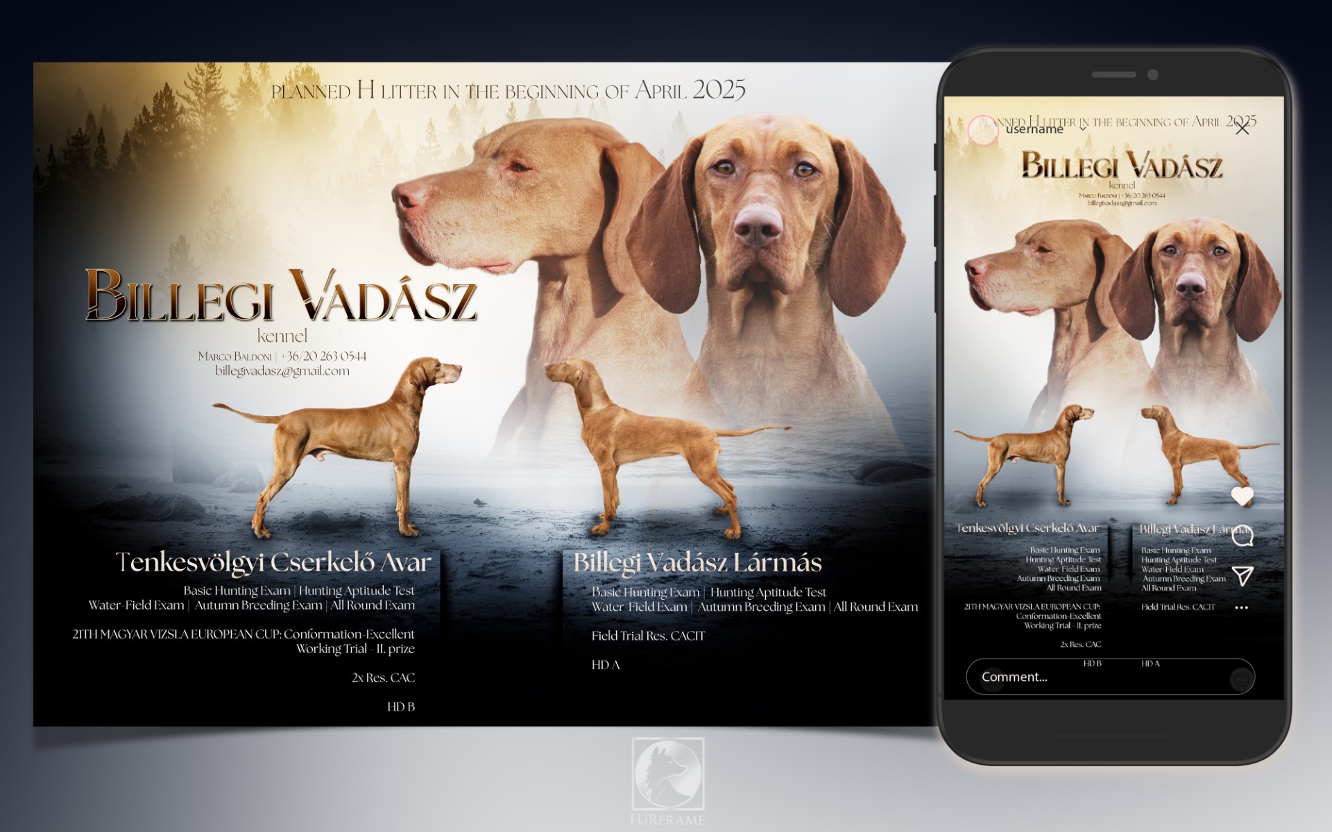 A szolgáltatás részeként minden egyes anyagot a legnagyobb gondossággal készítek el, hogy tökéletesen tükrözze az egyedi igényeket. Külön ajándékként a vizuális anyagokat Facebook-borító vagy Story-formátumban is elkészítem, hogy az online megjelenés még hatásosabb legyen. Emeld ki tenyésztési munkád színvonalát és kutyáid varázsát egyedi grafikai designnal!